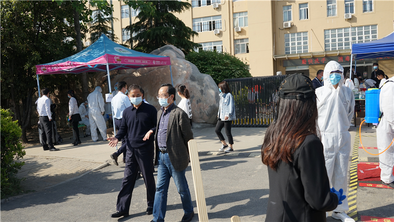 姚健等一行认真检查了我校出入管理、教学环境消毒、防控物资贮备等工作。校长详细汇报了我校疫情防控各项工作落实情况、教学准备、师生情况等。
