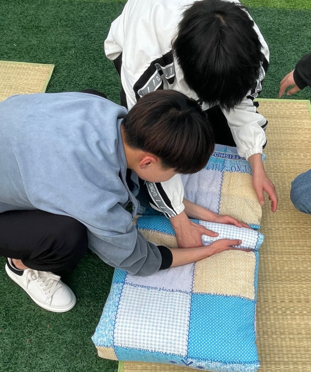 在老师们的指导下,原本散乱的被子瞬间变成了方方正正的“豆腐块”,整个操场上洋溢着热情的气氛,同学们也露出了快乐的笑脸。