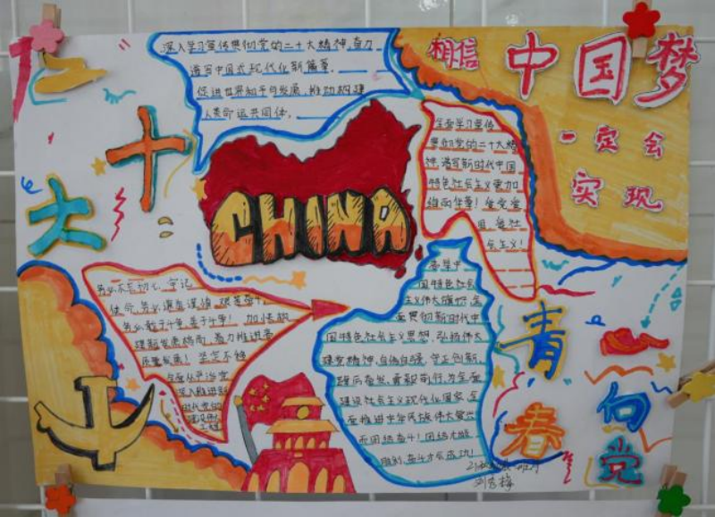 活动中,学生们认真查阅资料,了解党的发展历史,利用美术字、图画等艺术形式进行了精心的设计。一张张各具特色、主题鲜明、图文并茂的作品蕴含了同学们对党的热爱,对祖国的祝福,表达了对祖国繁荣富强,欣欣向荣的美好憧憬,以及新时代青少年为实现中国梦而努力奋斗的决心!