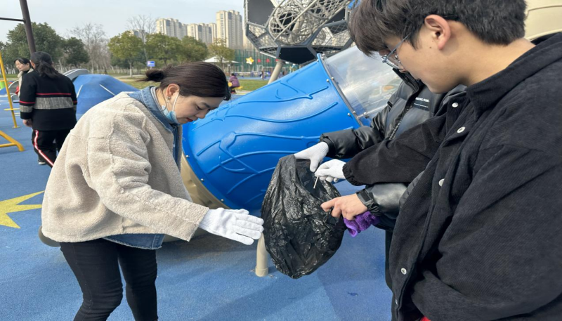 图三 我校团委书记鲍远娟和同学们一起清洁公园内游乐场