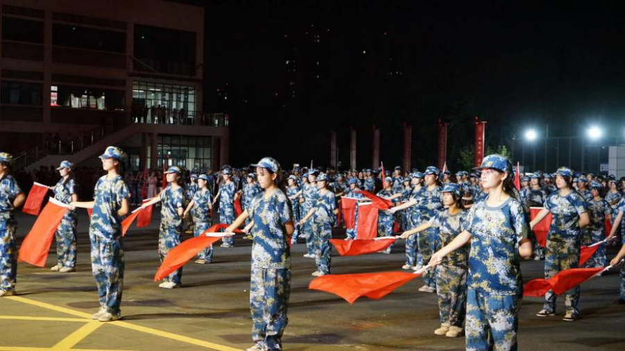晚会以一场震撼人心的国防教育成果展演作为开场,瞬间点燃了现场的热情。新生们以整齐的队列、铿锵的步伐、嘹亮的口号,向全校师生展示了国防教育期间所铸就的钢铁意志和团队精神。战术展示中,他们如同真正的战士,动作敏捷、配合默契;十二生肖拳则巧妙地将传统文化与武术精髓相结合,展现出独特的魅力;韵律操与旗舞更是将青春活力与爱国情怀完美融合,赢得了阵阵喝彩。
