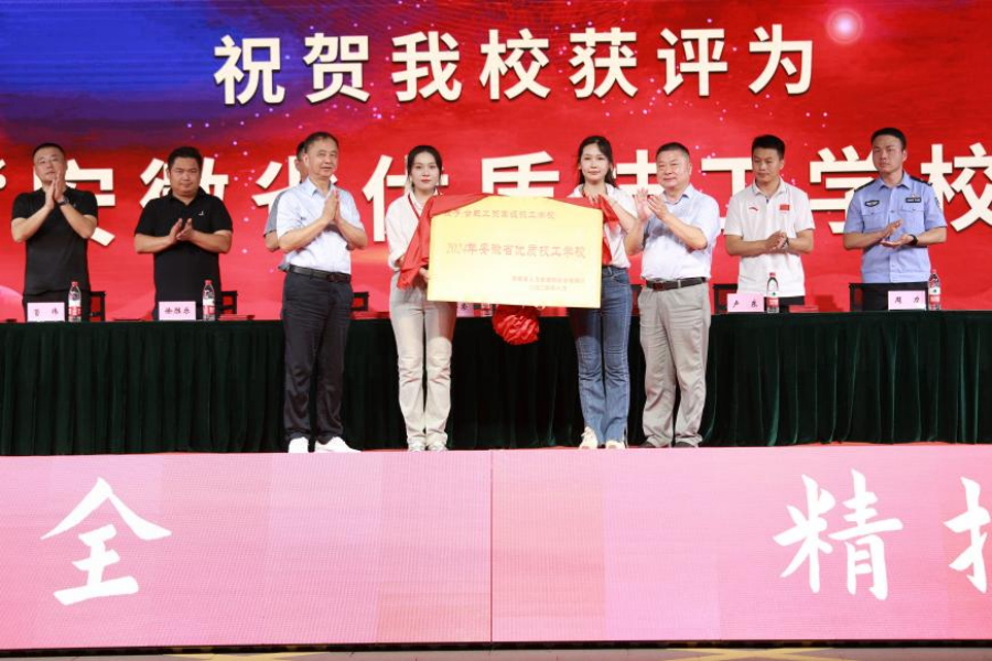 然而,这还不是今晚的全部惊喜,学校迎来了一个更加重要的时刻——“优质技工学校建设项目单位”揭牌仪式。安徽工贸教育集团董事长、创校校长朱邦荣和合肥市人力资源和社会保障局党组成员副局长陶成共同上台,为这一荣誉揭牌。这标志着合肥工贸高级技工学校在教学质量、师资力量、实训设施等方面得到了上级部门的高度认可和肯定,也预示着学校将迈入一个新的发展阶段,为培养更多高素质的技能型人才贡献力量。
