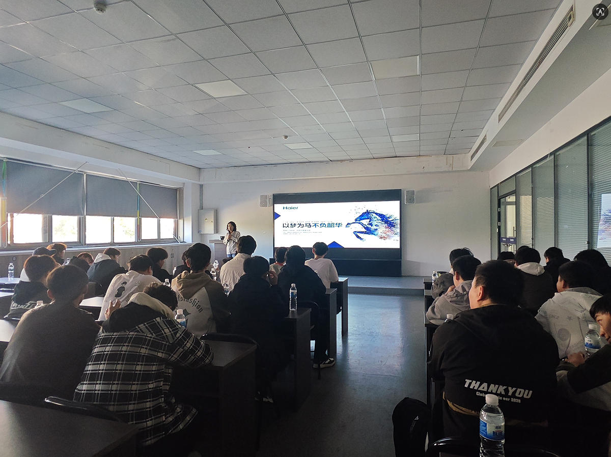 活动当日,学生们统一乘车前往,抵达基地后先深入生产流水线,近距离参观智能家电从零部件组装到成品下线的全流程。企业讲解人员结合现场设备,详细介绍了自动化生产线的运作原理、智能检测技术的应用细节,以及海尔在精益生产、质量管控方面的先进经验,让同学们直观感受到现代制造业的高效与精准。随后企业人员在汇报厅进行了演示与互动,让同学们系统了解企业发展、核心技术及人才需求标准。