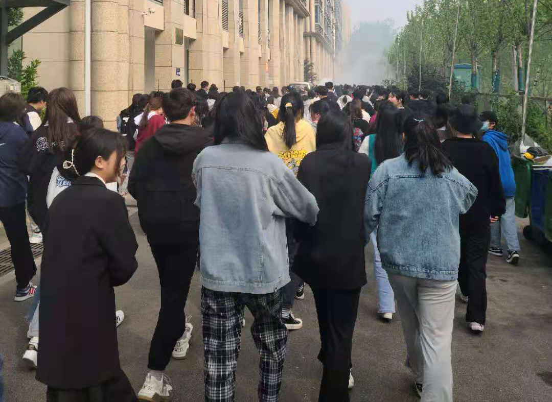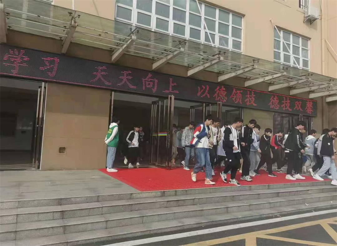 4月14日16时徐,随着“警报声”响起,消防安全应急疏散演练正式开始。同学们在各班老师的组织下,用湿毛巾捂着口鼻,猫着腰,分楼道,按照事先设定的疏散路线快速、有序的撤离,到达安全区域后,由老师立刻清点人数并及时上报。整个疏散过程在5分钟内完成,学生安全有序到达疏散的指定地点。