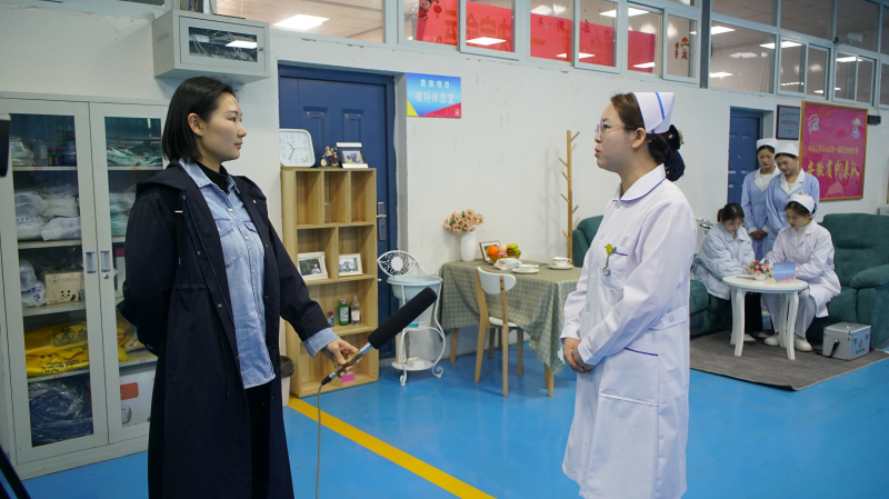 徐主任向记者介绍护理专业学生在各大竞赛中与职业院校学生同台竞技时荣获优异成绩。