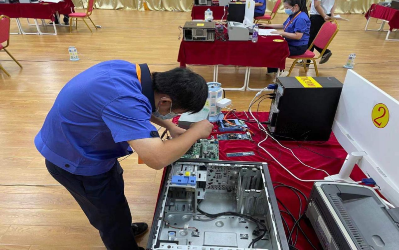 在计算机及外部设备装配调试员实操比赛现场,参赛选手胸有成竹,利用手中的工具在工作台熟练地组装计算机,比赛氛围紧张而激烈。