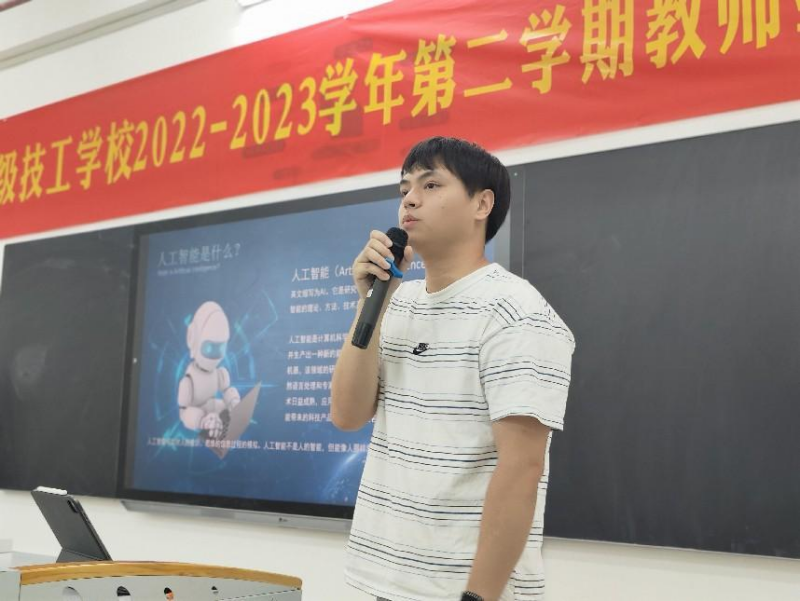 最后,张忠老师进行了《教师信息化能力》分享,讲述了人工智能发展现状以及人工智能对教育的改变,让全体教师对于人工智能有了更深的认识和理解,为我校教师的信息化能力的提高奠定基础。