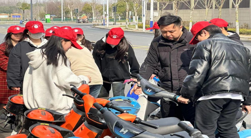 图二 我校专职副书记陈军带领学生们清洁共享单车