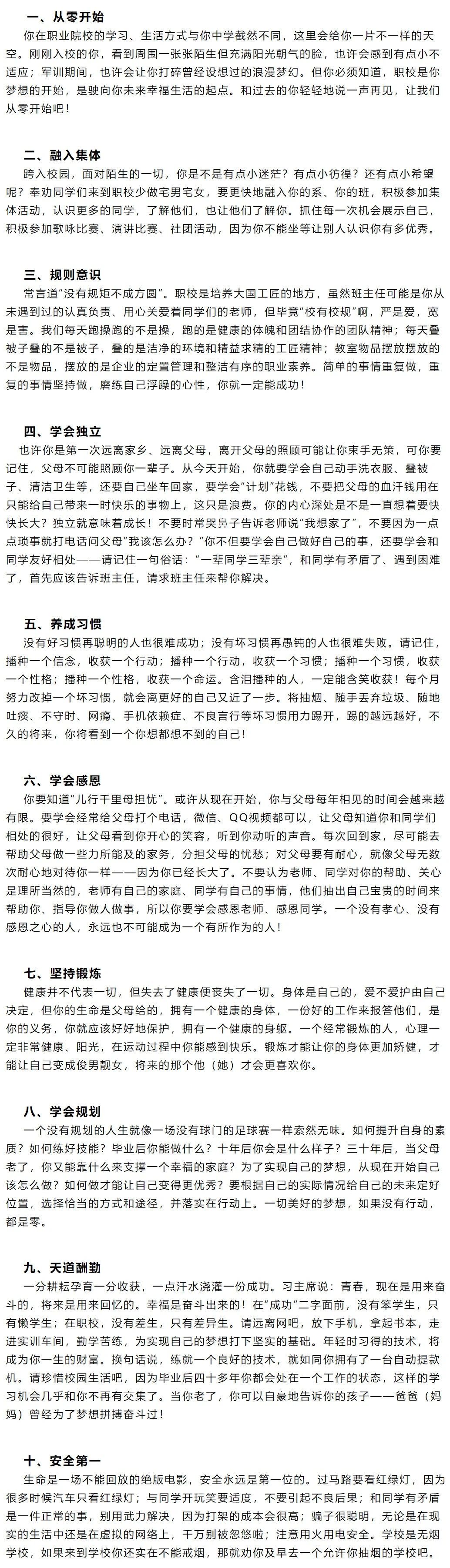 带着父母的期望,踏着八月的热浪,怀揣青春的憧憬,为了实现自己的梦想,你走进了学校。在这里我只想说:回望走过的路,你也许跌倒过,消沉过,然而青春的步伐不会因为曾经的坎坷而停滞,人生的旅途只有经历更多磨练,才能使你更加优秀,成就你人生的辉煌!