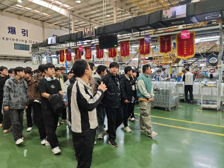 活动当日,学生们统一乘车前往,抵达基地后先深入生产流水线,近距离参观智能家电从零部件组装到成品下线的全流程。企业讲解人员结合现场设备,详细介绍了自动化生产线的运作原理、智能检测技术的应用细节,以及海尔在精益生产、质量管控方面的先进经验,让同学们直观感受到现代制造业的高效与精准。随后企业人员在汇报厅进行了演示与互动,让同学们系统了解企业发展、核心技术及人才需求标准。